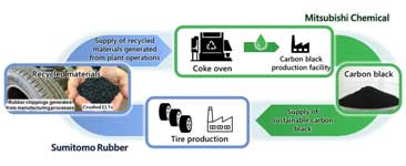 Sumitomo Rubber and Mitsubishi Chemical have formed a collaborative framework where the two companies pursue resource recycling initiatives for carbon black, a primary raw material of tyres. Sumitomo Rubber supplies rubber chippings generated from tyre manufacturing processes and crushed ELTs (recycled materials) to Mitsubishi Chemical.