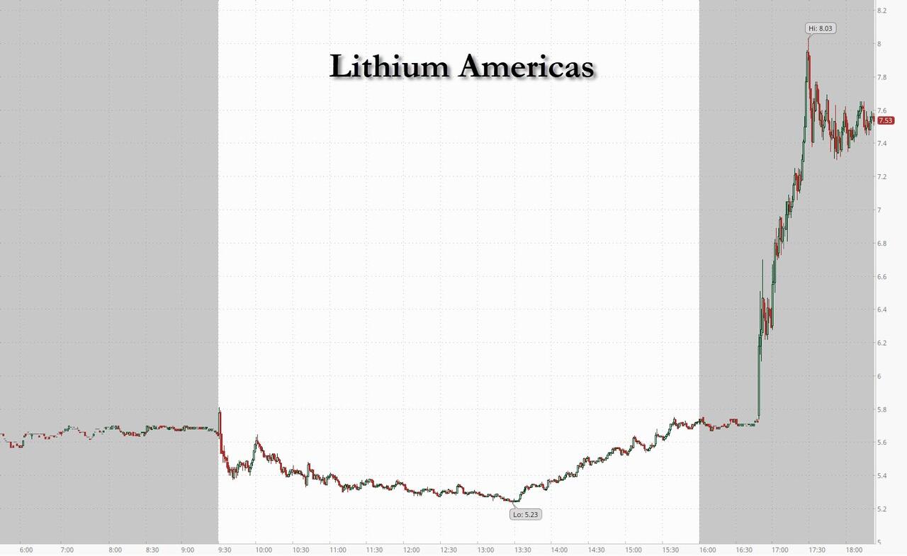 The US-listed shares of Lithium Americas have risen 92% this year and soared 32% to $7.53 in after-hours trading Tuesday.